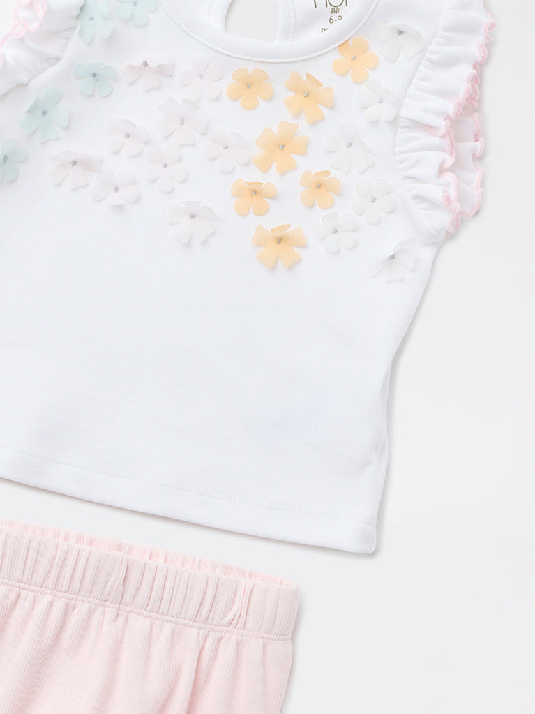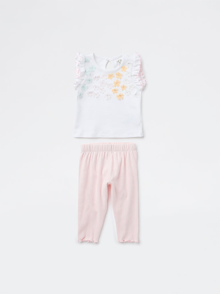 HOP Baby Girls White Floral Applique Detailed Cotton Top and Pants Set
