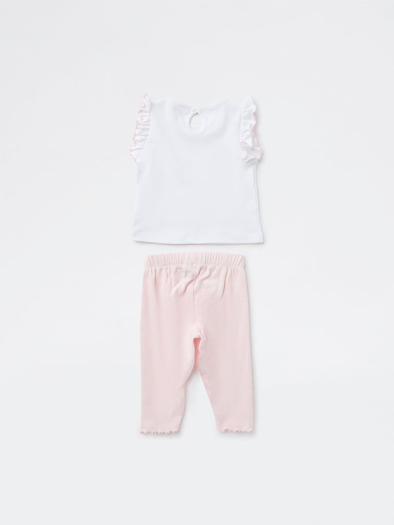 HOP Baby presents this charming set featuring a crisp white cotton top paired with soft pastel pink pants for a sweet, coordinated look. The round-neck, sleeveless top showcases delicate multicoloured floral appliqué and playful ruffled trims at the shoulders, while the pants feature an elasticated waistband and ruffled hems. Finished with a keyhole button closure at the back for easy dressing, this breathable duo keeps your little one comfortable and stylish for any outing.