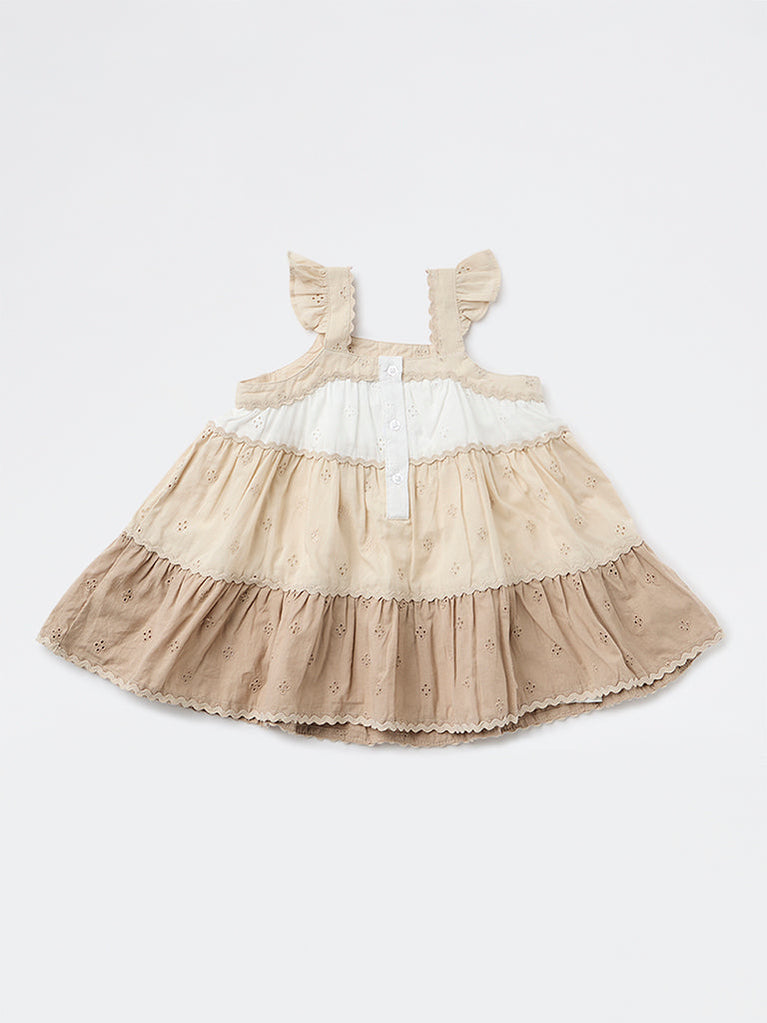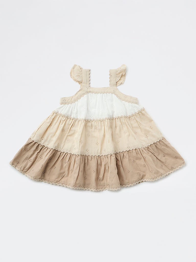 HOP Baby presents this delightful dress crafted from soft, breathable cotton for everyday comfort. Styled in a colour-block design with white, beige, and brown tones, it features delicate schiffli detailing and playful floral and fruit-inspired prints along the lower panel. The design includes a square neckline leading to a two-button placket and butterfly sleeves, while the gently flared silhouette adds a sweet finishing touch.