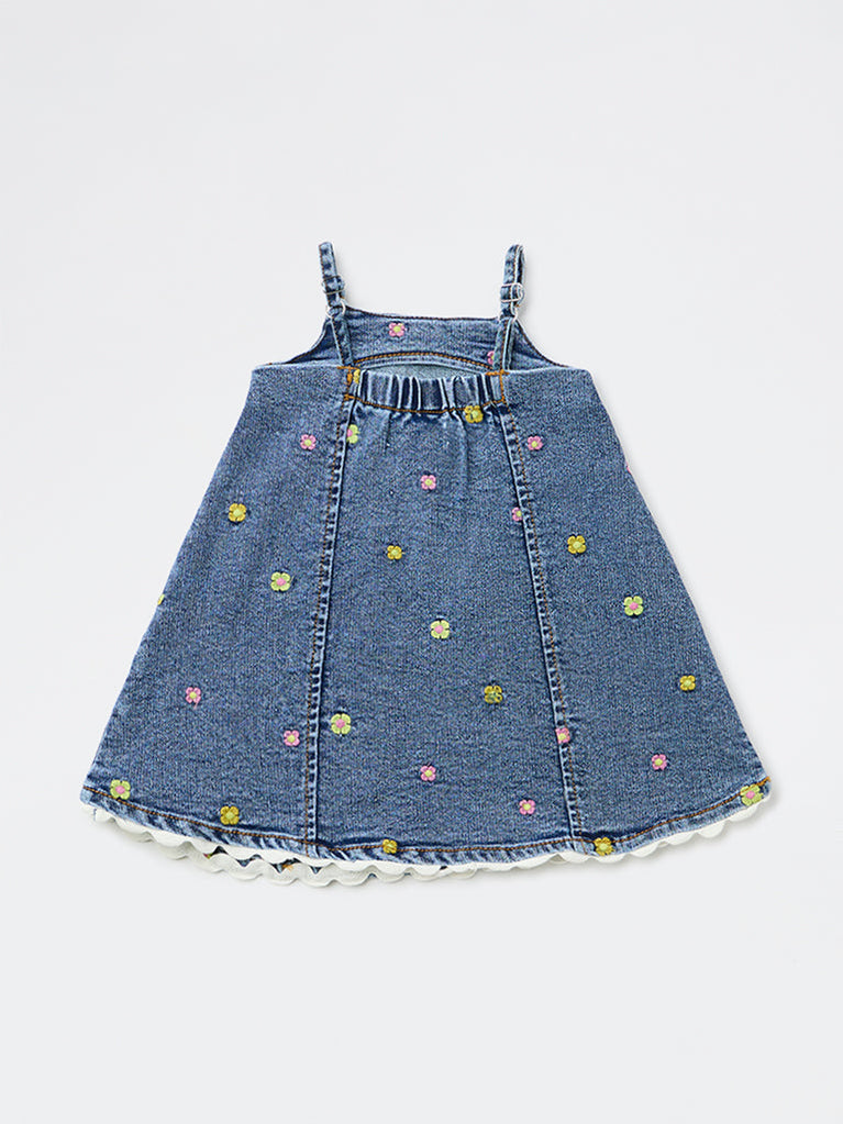 Sweet and playful, this denim blue dress from HOP Baby is crafted from a comfortable cotton-blend fabric for everyday wear. Designed in a sleeveless A-line silhouette, it features delicate floral embroidery in vibrant tones across the fabric. Slim shoulder straps and a scalloped white trim along the hem add a charming finish, while the elasticated back panel ensures a secure and comfortable fit.
