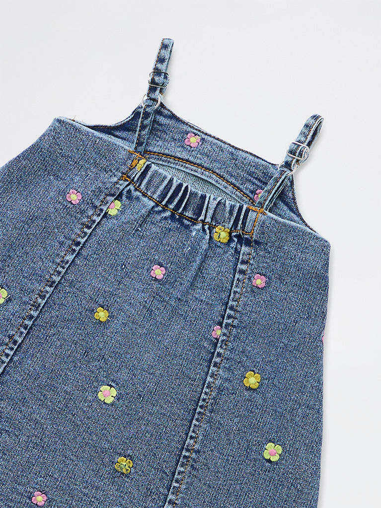 HOP Baby Girls Blue Floral Embroidered Denim Dress