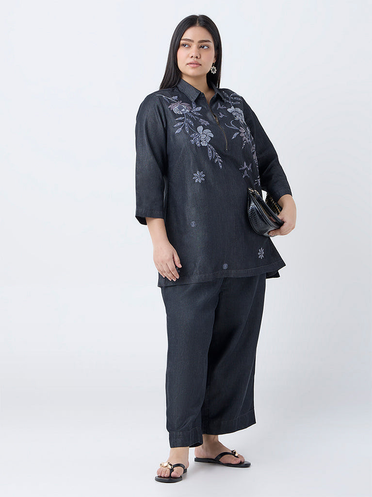 Diza Charcoal Floral Embroidered Cotton-Blend Tunic