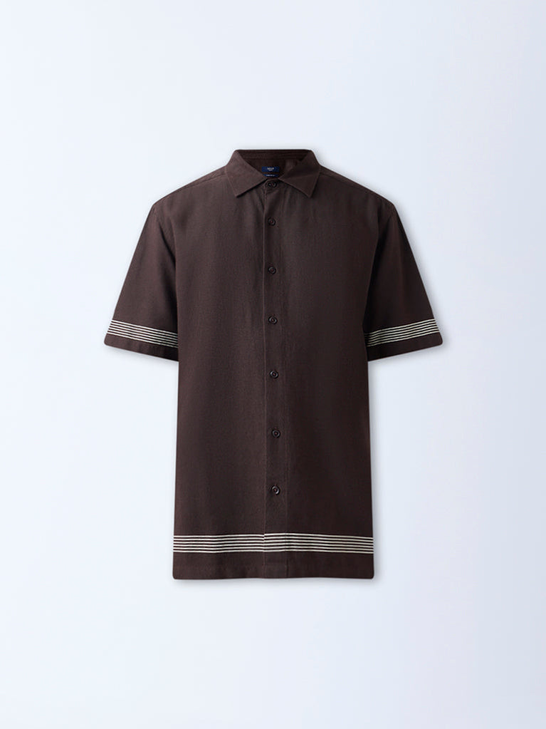 Ascot introduces this dark brown shirt, crafted from a premium linen blend for an airy, breathable feel. Designed in a relaxed handle, it features short sleeves, a classic collar, and understated stripe detailing that adds depth and texture.