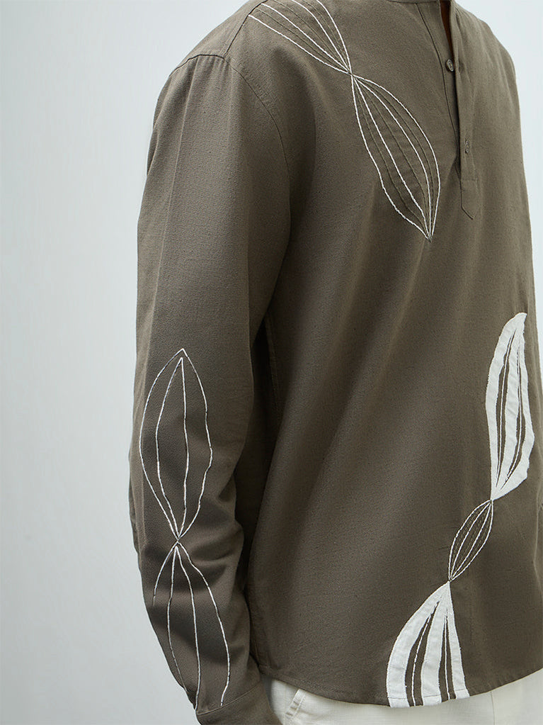 ETA Taupe Floral Embroidered Relaxed-Fit Cotton Shirt