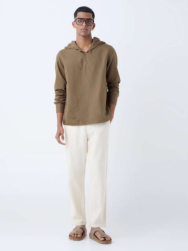 ETA Brown Solid Relaxed-Fit Cotton-Blend Hooded Shirt