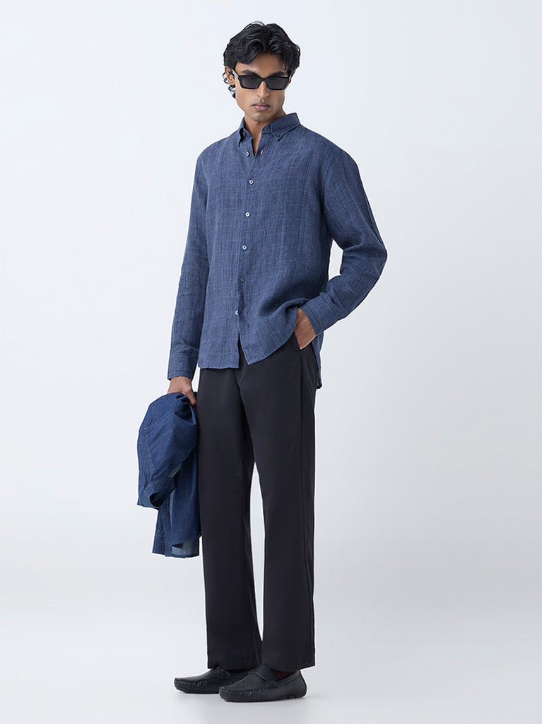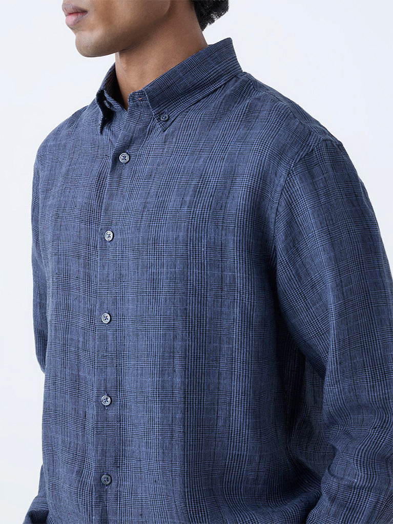 Ascot Dark Blue Checks Patterned Relaxed-Fit Linen Shirt