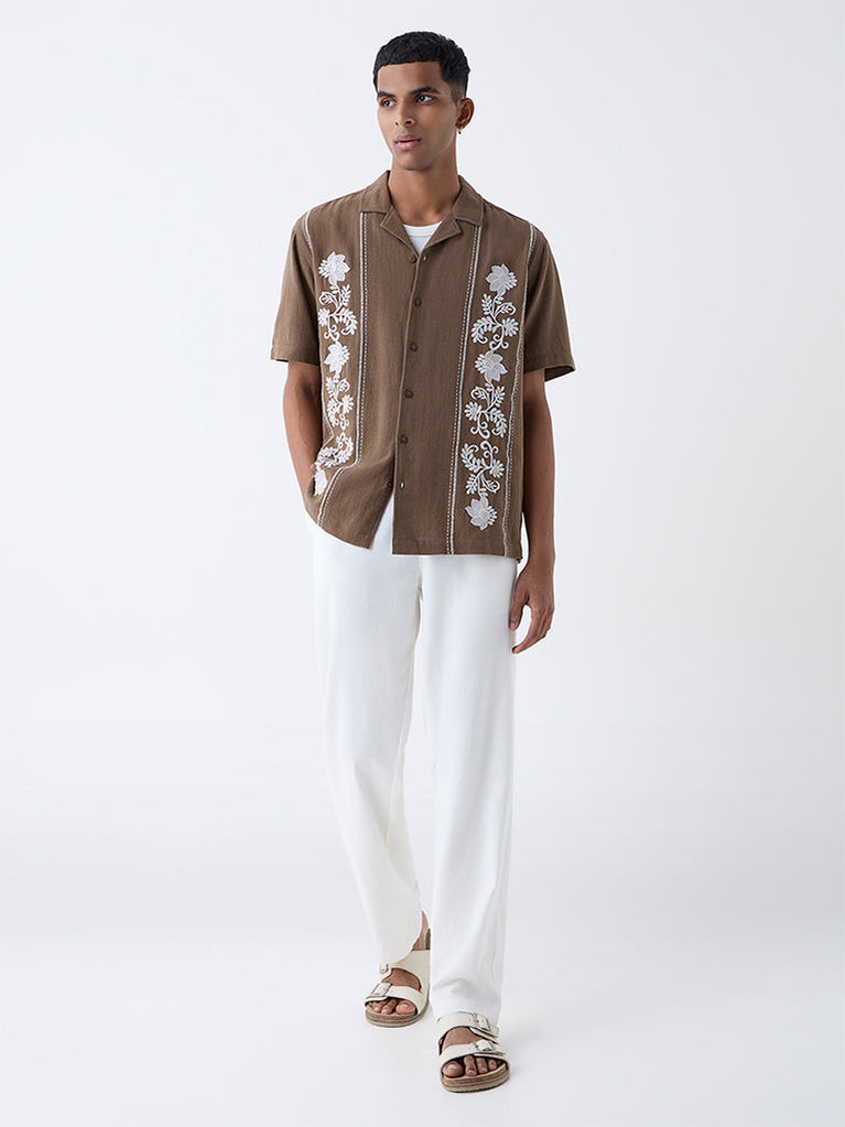 ETA Brown Floral Embroidered Relaxed-Fit Cotton Shirt
