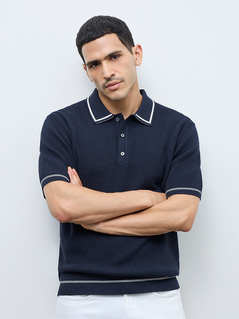 Ascot presents this navy polo t-shirt woven from a cotton-blend fabric with a knit-textured finish. It is designed in a relaxed fit, carrying a contrast detailed collar, a brief button placket and short sleeves. Finished with stripe-printed accents on the sleeves and hem, it adds a refined touch to everyday casual wear.