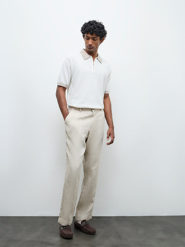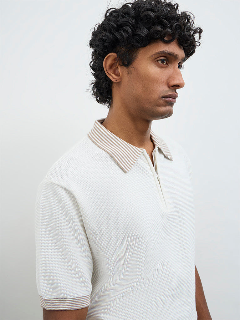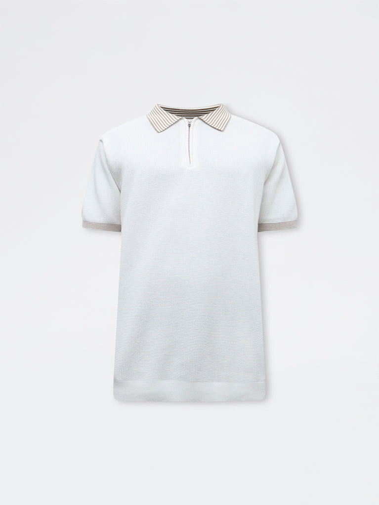 Ascot brings a refined update to everyday dressing with this off-white polo t-shirt. Sculpted in a relaxed silhouette from a soft, breathable fabric, it offers lasting comfort through the day. Designed with a stripe-printed collar, a short zipper placket and short sleeves, the piece is finished with a tactile textured surface that enhances its structured silhouette. Suitable for both casual outings and workday looks.