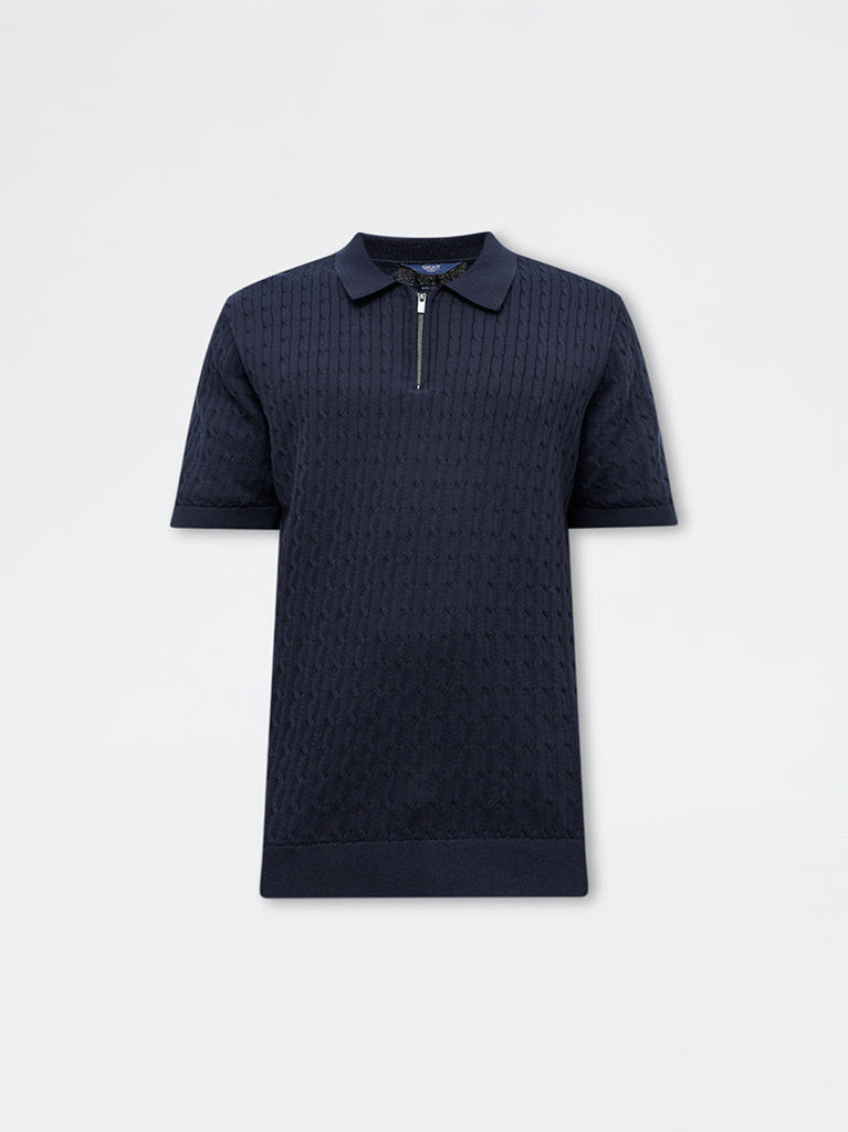 Ascot introduces this navy polo T-shirt, designed with a relaxed fit that balances comfort with a refined look. Crafted from a cotton rich fabric, it features a cable knit texture that enhances breathability while adding depth to the silhouette. Finished with a classic collar, a short zipper placket and short sleeves, it delivers a clean, structured appeal suited for everyday wear.