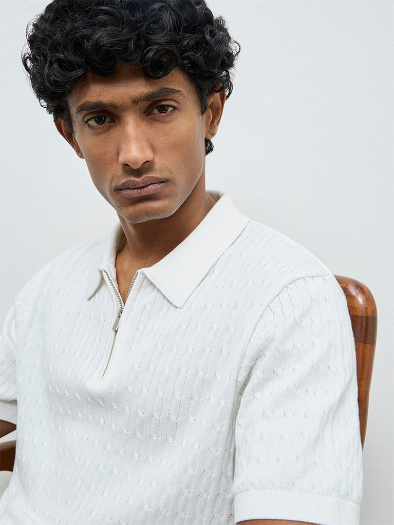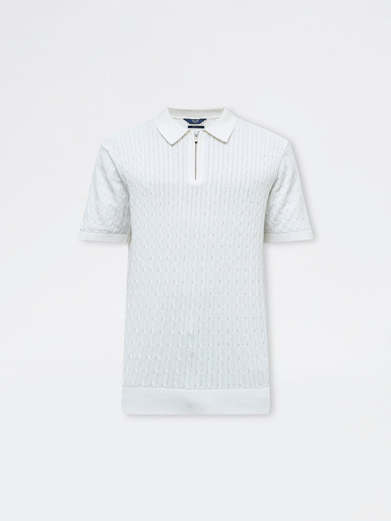 Ascot Off-White Cable-Knit Relaxed-Fit Quarter-Zip Cotton Polo T-Shirt