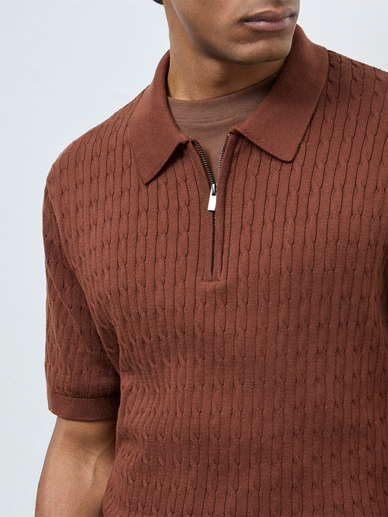 Ascot Rust Cable-Knit Relaxed-Fit Quarter-Zip Cotton Polo T-Shirt