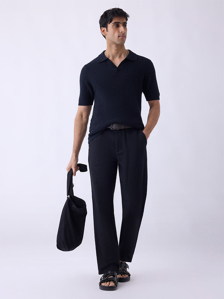 Upgrade your off-duty rotation with this black t-shirt from ETA. Spun from a lightweight fabric with a distinctive knit texture, it offers a relaxed fit that moves effortlessly with you. Styled with a sharp polo collar and short sleeves, this tee combines modern simplicity with everyday comfort.