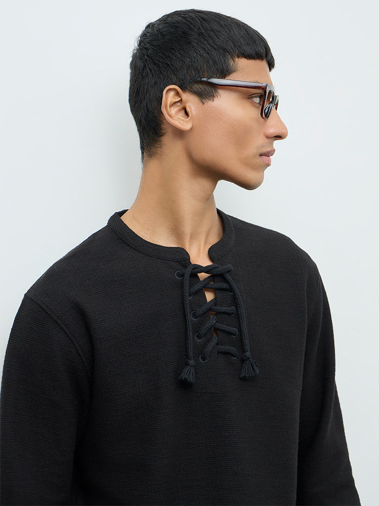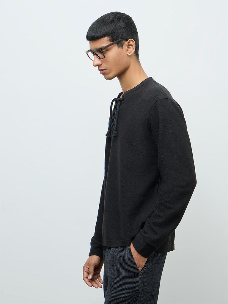 Bringing subtle character to casual looks, this black t-shirt from ETA is detailed with a criss-cross lace-up neckline. Crafted from a soft cotton-blend fabric, it delivers breathable comfort with a gentle textured feel. Shaped in a relaxed silhouette and finished with full-length sleeves, it is well suited for easy layering and off-duty wear.