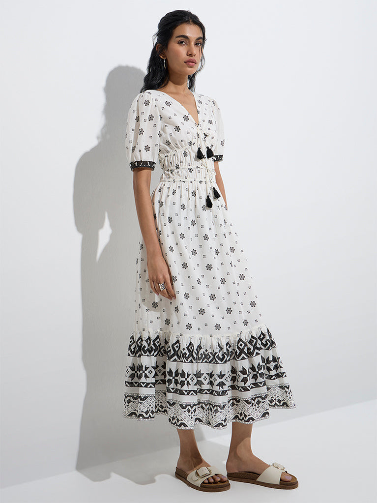 Bombay Paisley White Floral Design Cotton Tiered Dress