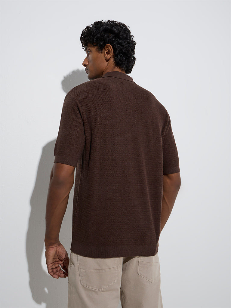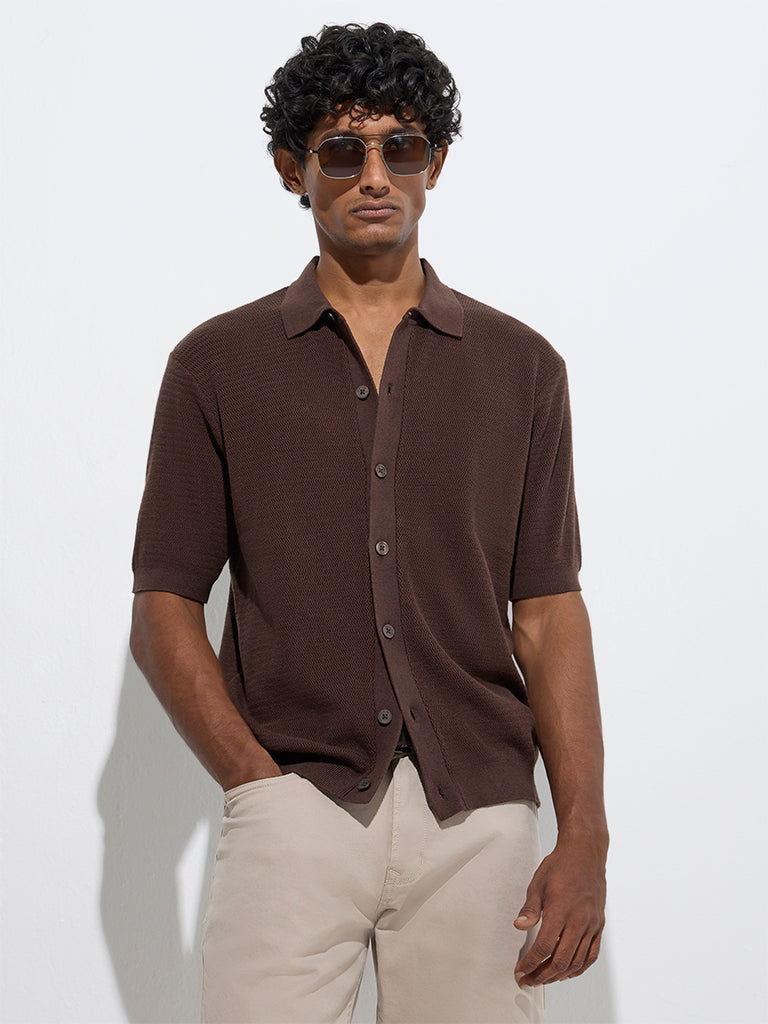 Ascot Brown Knit-Textured Relaxed-Fit Cotton-Blend Shirt