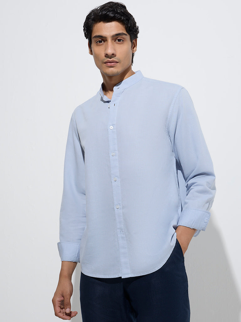 This light blue shirt from Ascot is constructed from a premium linen-blend fabric and tailored in a relaxed silhouette. It features full sleeves, a button-up front, and a neat mandarin collar, making it a stylish piece that adds a dapper touch to your casual wardrobe.