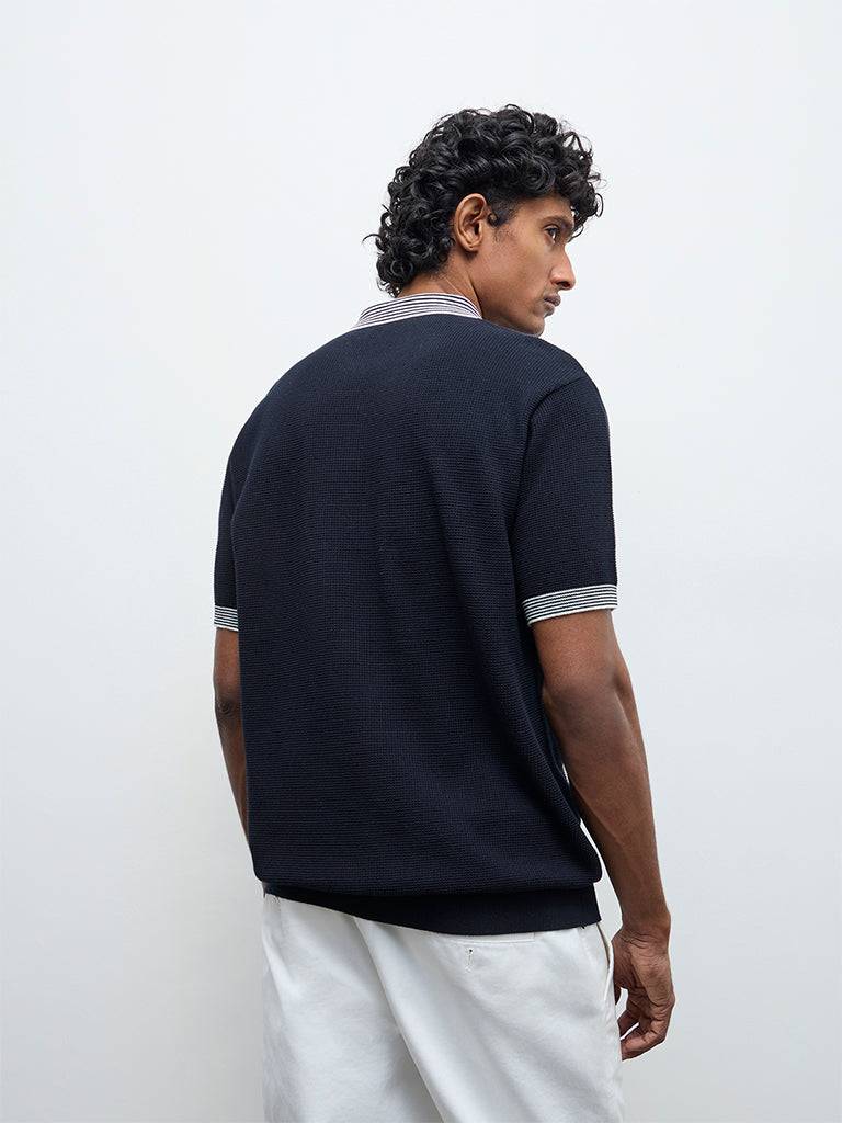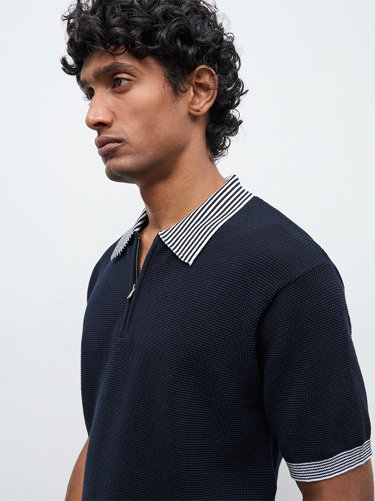 Ascot presents this navy polo t-shirt constructed from a soft, breathable fabric in a relaxed fit that offers a comfortable, laid-back feel. Styled with a stripe printed collar, a short zipper placket and short sleeves, this piece is finished with a tactile textured surface that elevates the structured silhouette. This piece works well for both casual outings and workday looks.