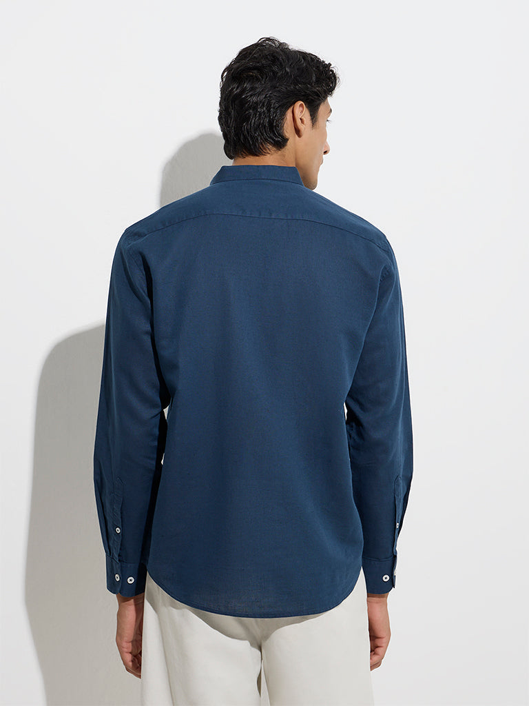 Ascot Navy Solid Relaxed-Fit Linen- Blend Shirt