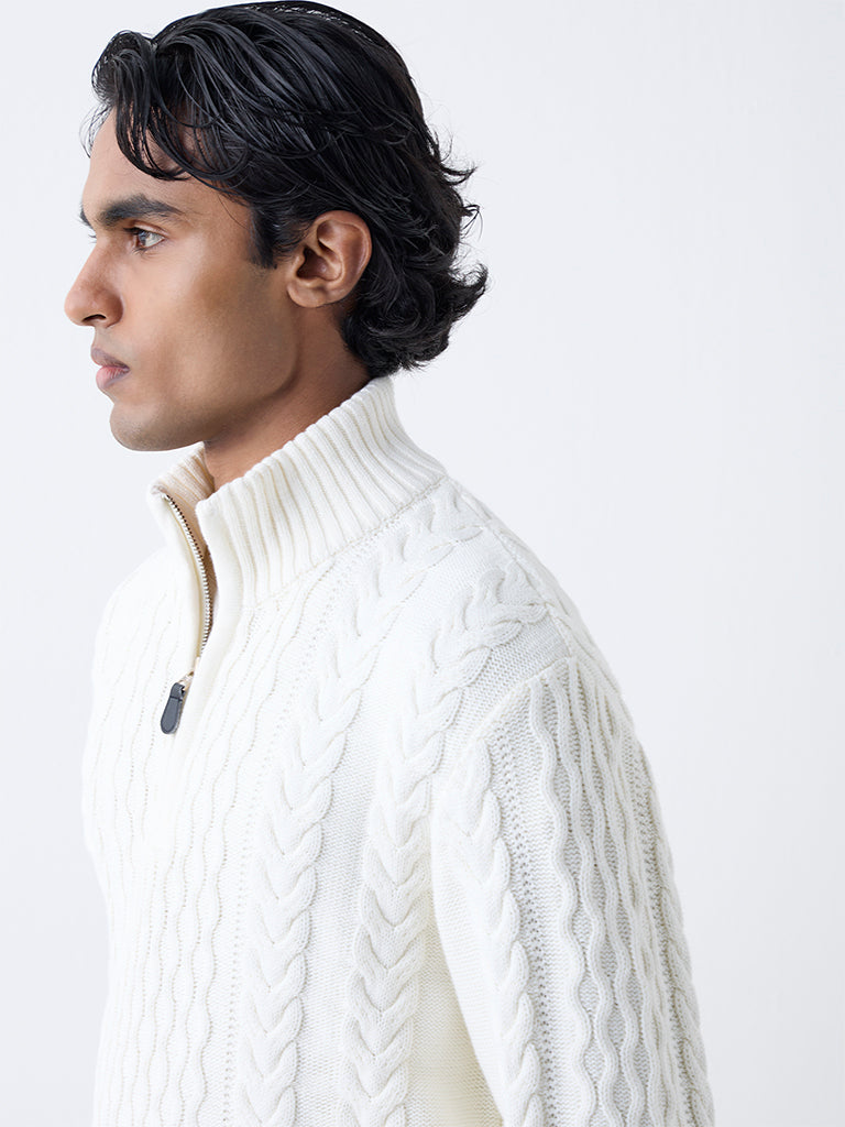 Ascot presents this off-white sweater featuring a high neck, a short zipper closure and full sleeves for a clean, structured look. Knitted from pure cotton fabric, it is finished with a cable-knit pattern that brings depth to the design. Soft, warm and effortlessly stylish, it stands out as a dependable choice for the winter season.