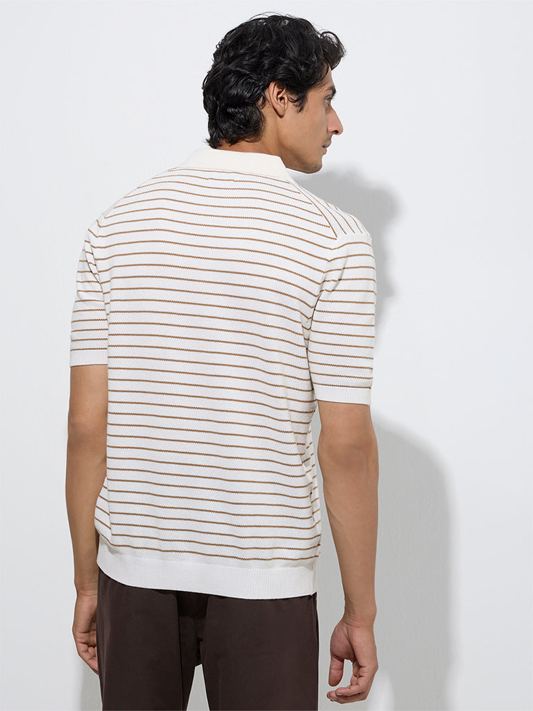 Minimal with a touch of detail, this taupe polo t-shirt from Ascot is defined with striped prints that add texture to its clean silhouette. Woven from a knit-textured fabric, it’s cut in a relaxed fit and styled with a V-neck collar and half sleeves.