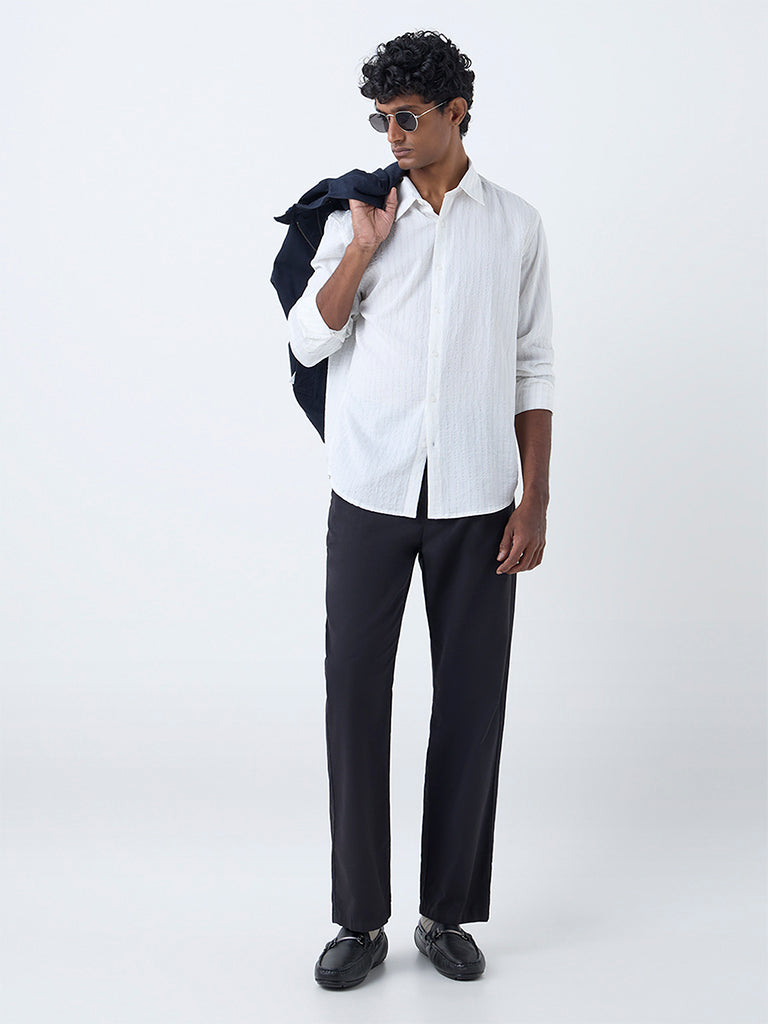 Elevating wardrobe essentials, this white shirt from Ascot is woven with subtle stripe patterns across a refined textured base. Styled with a straight-point collar, button-up front and full sleeves, the breathable fabric blend ensures ease of wear while lending a polished note to smart-casual attire.