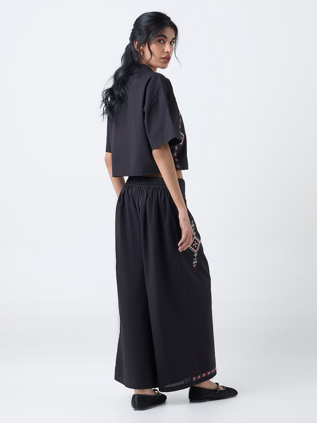 Elevate your Indo-western rotation with these black cotton-blend pants from Bombay Paisley, highlighted with traditional-inspired embroidery along the sides and hem. The relaxed silhouette and elasticated waistband ensure day-long ease, while side pockets add welcome practicality.