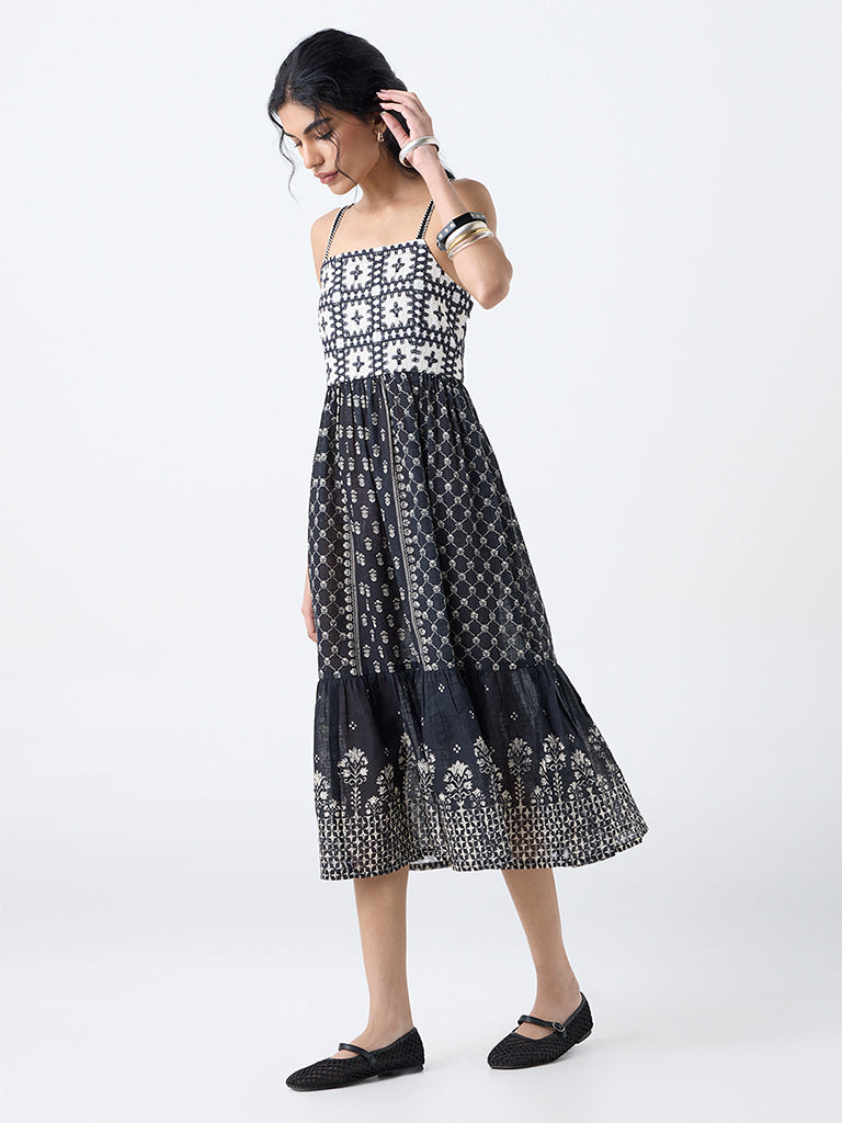Bombay Paisley Black Embroidered Cotton Tiered Dress