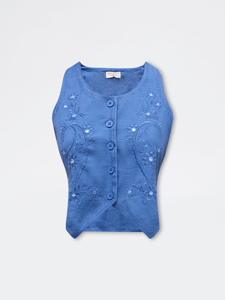 This blue waistcoat top from Bombay Paisley features tonal paisley embroidery complimented by mirror accents to add visual interest. It is framed with a round-neck, a buttoned placket and a sleeveless cut that offer a relaxed structure. Milled from cotton-rich fabric, the style remains comfortable for casual, day-long wear.