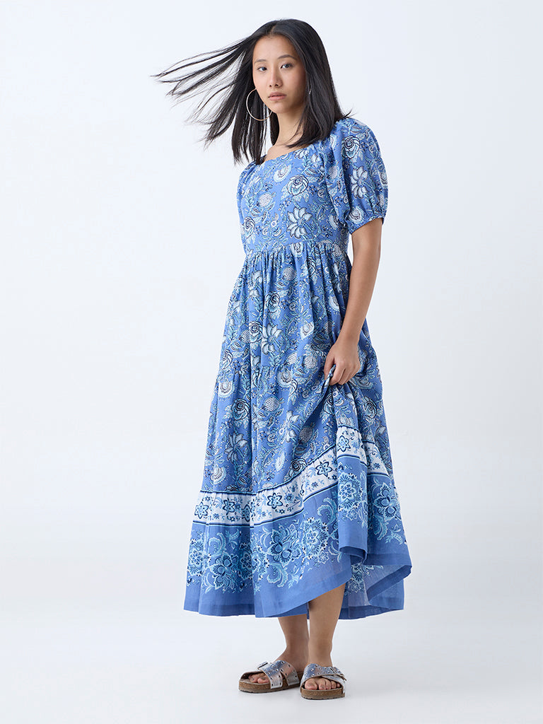 This blue dress from Bombay Paisley captures effortless elegance. Tailored in pure cotton and patterned with graceful florals, it features a square neck, puff sleeves, and a smocked back that ensures a flattering fit. The A-line silhouette flows with ease, making it an effortless choice for sunlit strolls or laid-back festive days.