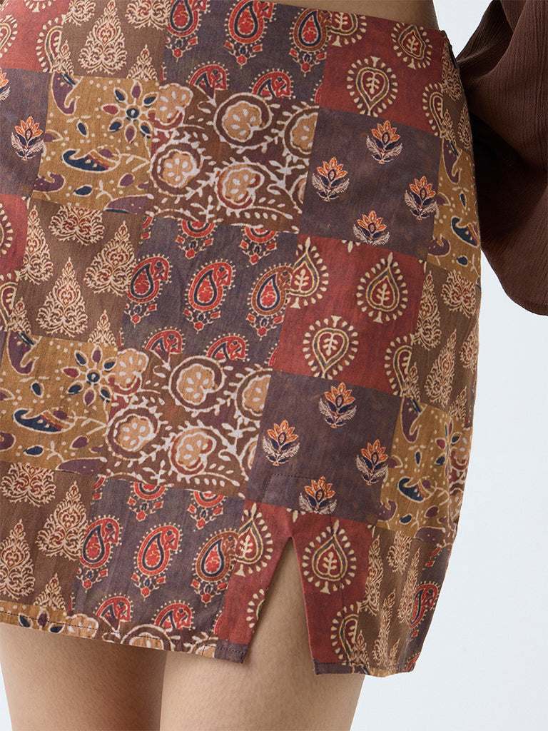 Enrich your off-duty style with this brown skirt from Bombay Paisley, adorned with vibrant block-pattern-inspired motifs that bring a touch of playful sophistication. Spun from pure cotton for enhanced comfort, it features an elasticated waistband and concealed zipper for effortless wear.
