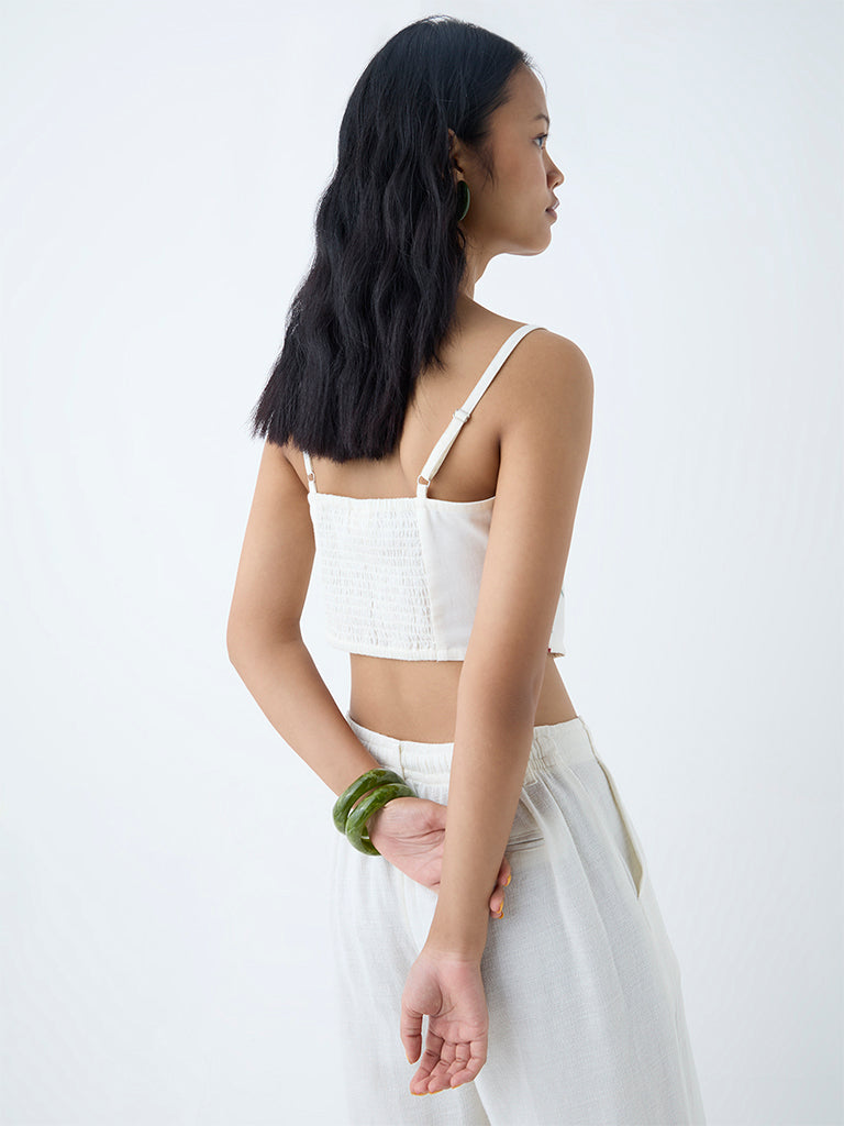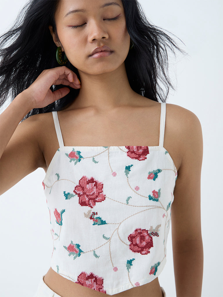 This ivory top from Bombay Paisley is embroidered with graceful florals that lend it a quiet elegance. The square neck and adjustable shoulder straps strike the perfect balance between structure and ease, while the smocked back offers a flattering fit.