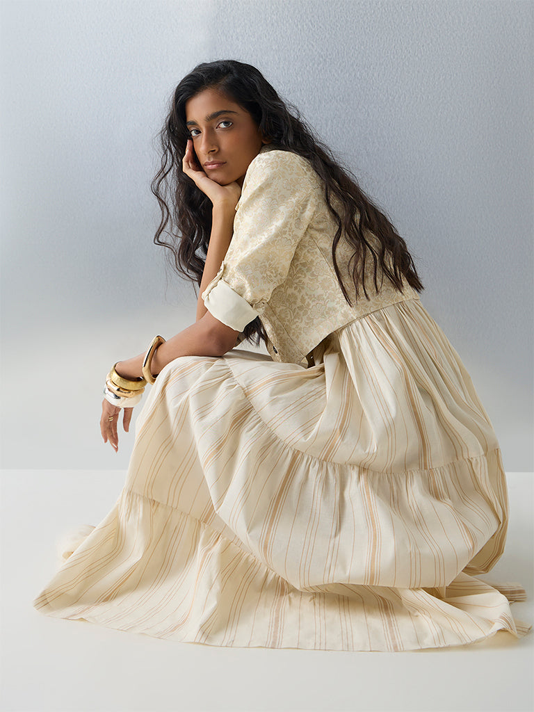 Bombay Paisley Off-White Striped Cotton Tiered Dress with Jacket