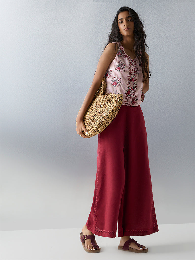 Infused with playful charm, this pink cotton top from Bombay Paisley pairs delicate floral motifs with subtle stripes for a modern twist. The round neck and button placket lend a touch of classic ease, while the sleeveless silhouette keeps it light and breezy.