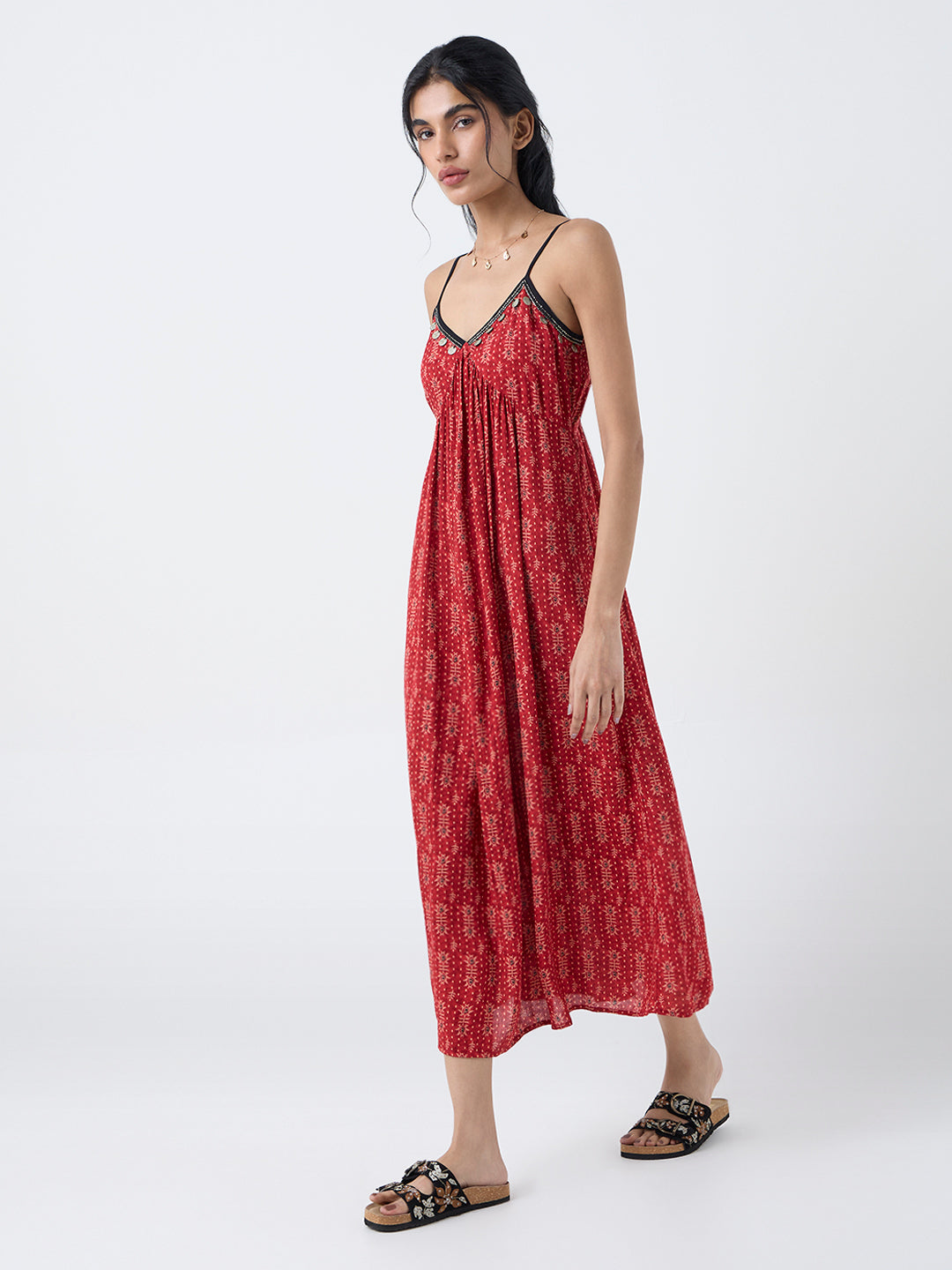 Radiate effortless elegance in this red empire-line dress from Bombay Paisley, decorated with traditional-inspired prints that add movement and depth. The embellished detailing enhances the neckline with subtle festive shimmer, while adjustable straps ensure a secure, personalised fit. Milled from a lightweight fabric, this dress is ideal for warm celebratory evenings, day-time gatherings or holiday travel.