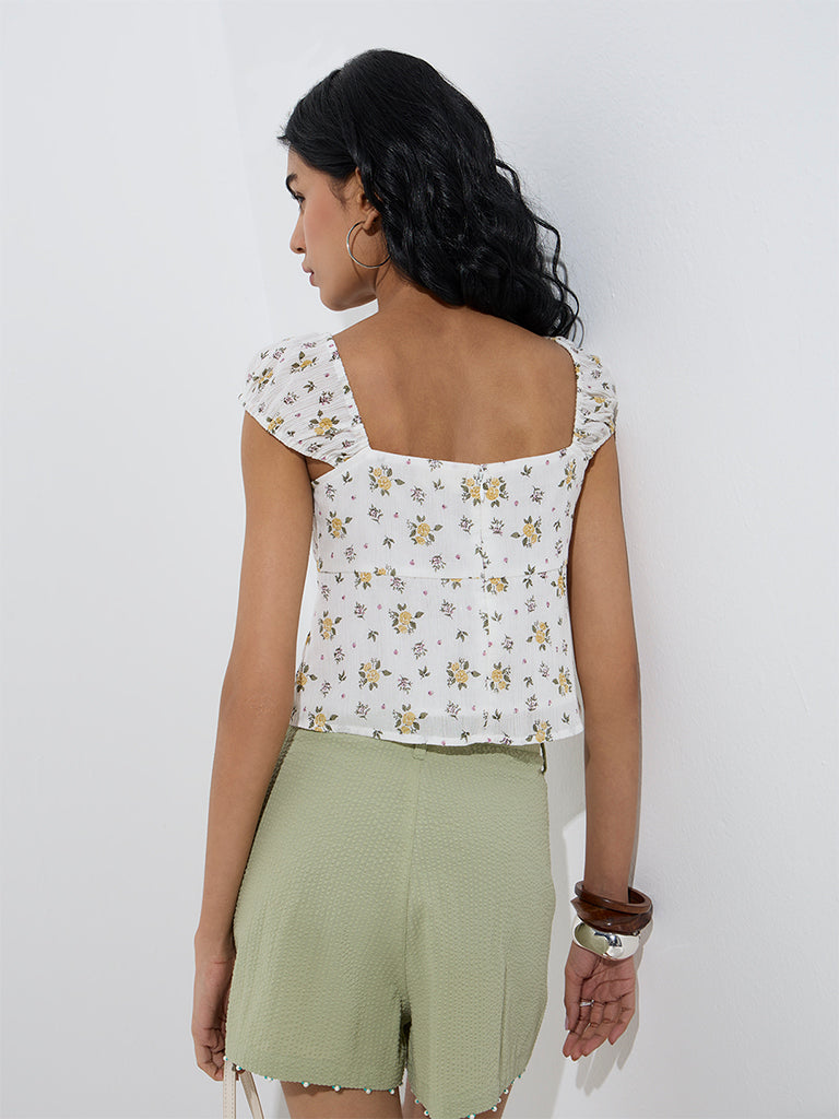 This white top from Bombay Paisley flaunts floral prints throughout for feminine charm. Designed with a round neckline and puff sleeves, the pure-cotton separate is finished with a zipper back for easy wearability and a polished look.