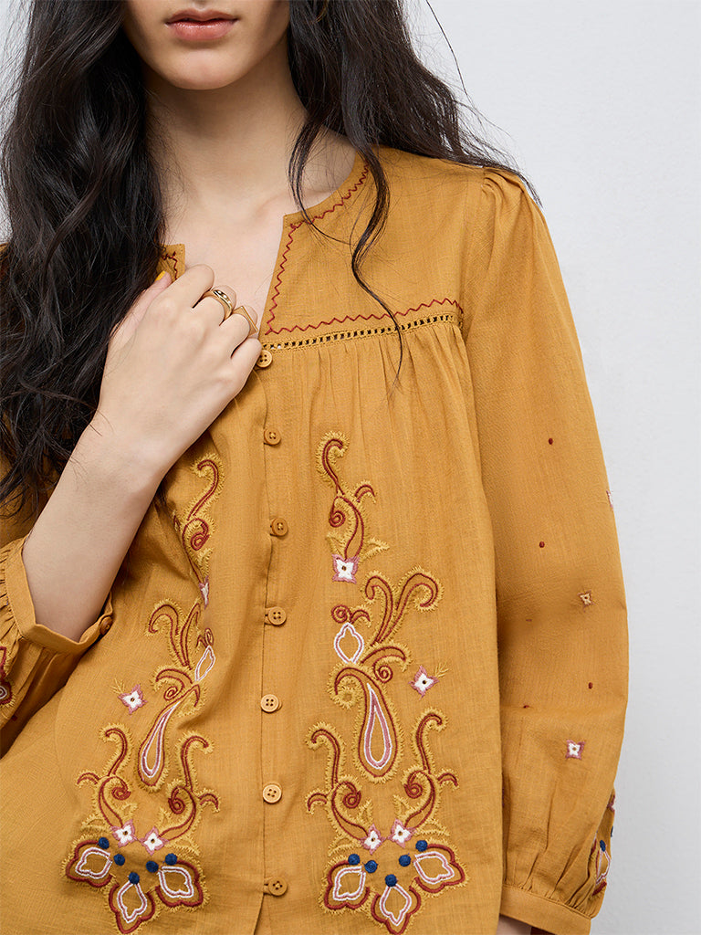 Rooted in intricate detailing, this yellow top from Bombay Paisley brings a distinctive touch to everyday styling. Embroidered motifs placed along the front add visual interest, complemented by a split neck, a buttoned placket and peasant sleeves that offer a relaxed structure. Milled from cotton-rich fabric, the style remains comfortable for casual, day-long wear.
