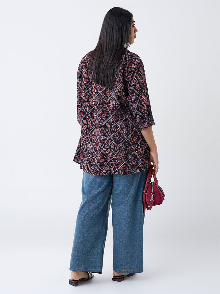 Diza launches this black tunic accentuated with eye-catching ethnic prints. Crafted from breathable fabric, it features a V-neck and three-quarter sleeves. A comfortable essential that combines everyday ease with contemporary style.