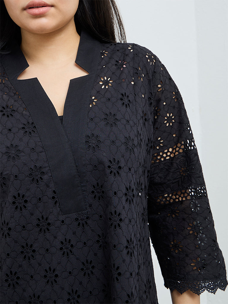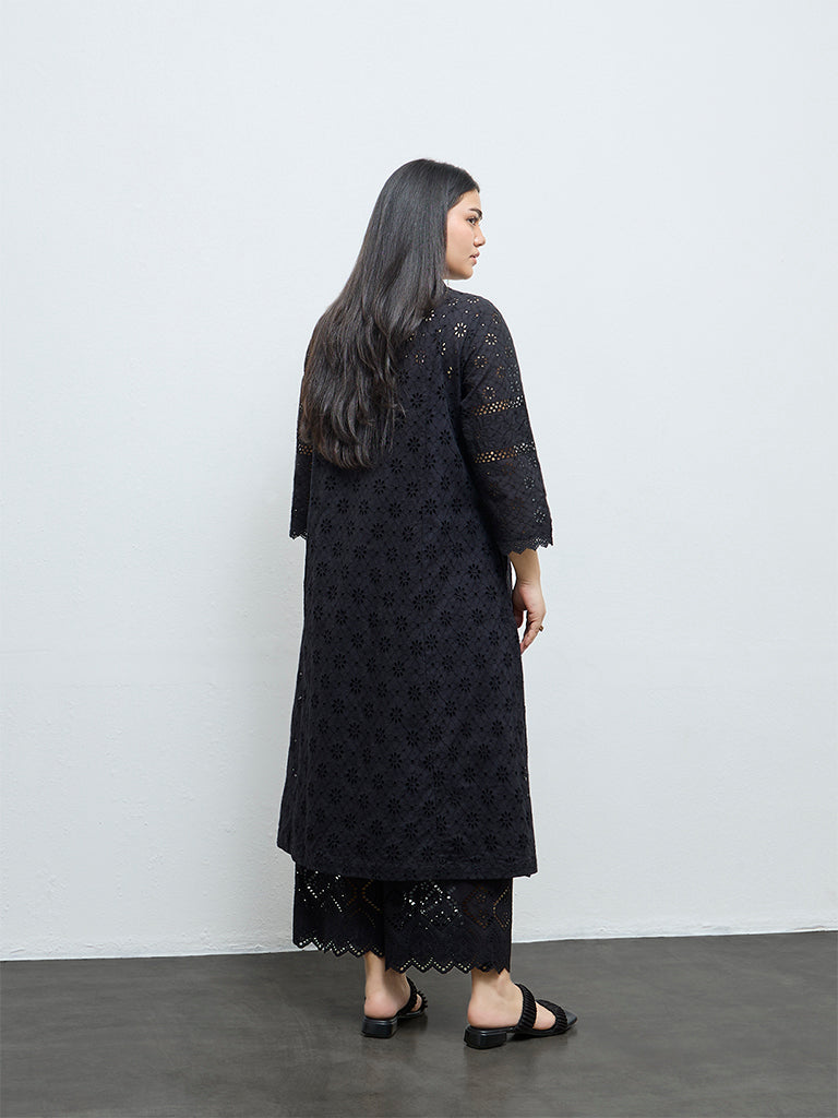 Diza Black Schiffli Embroidered A-Line Cotton Kurta