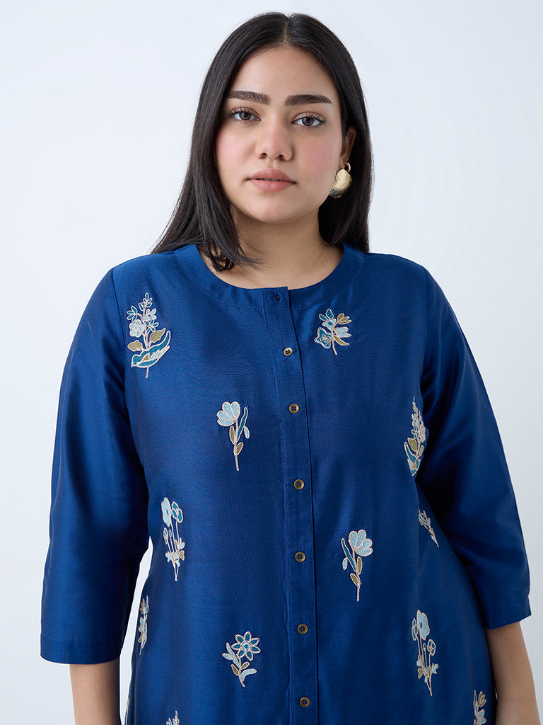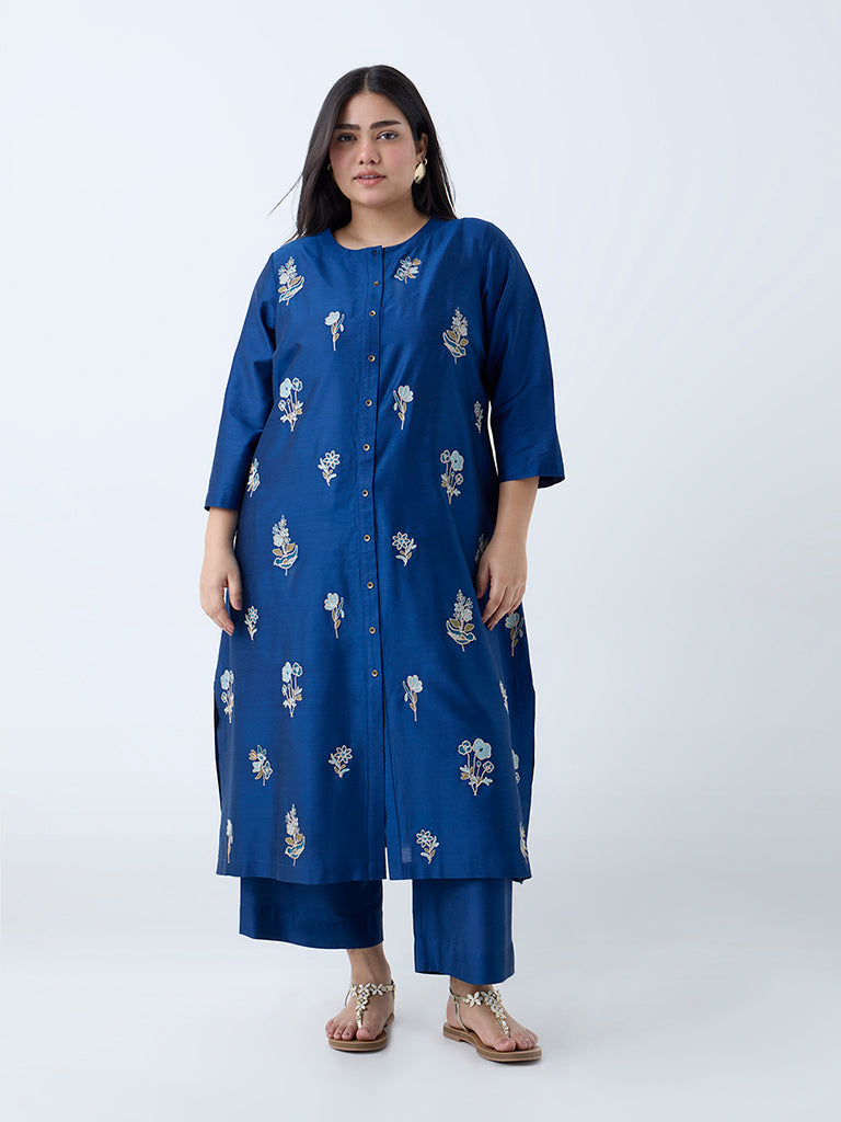 Diza Blue Floral Embroidered A-Line Kurta