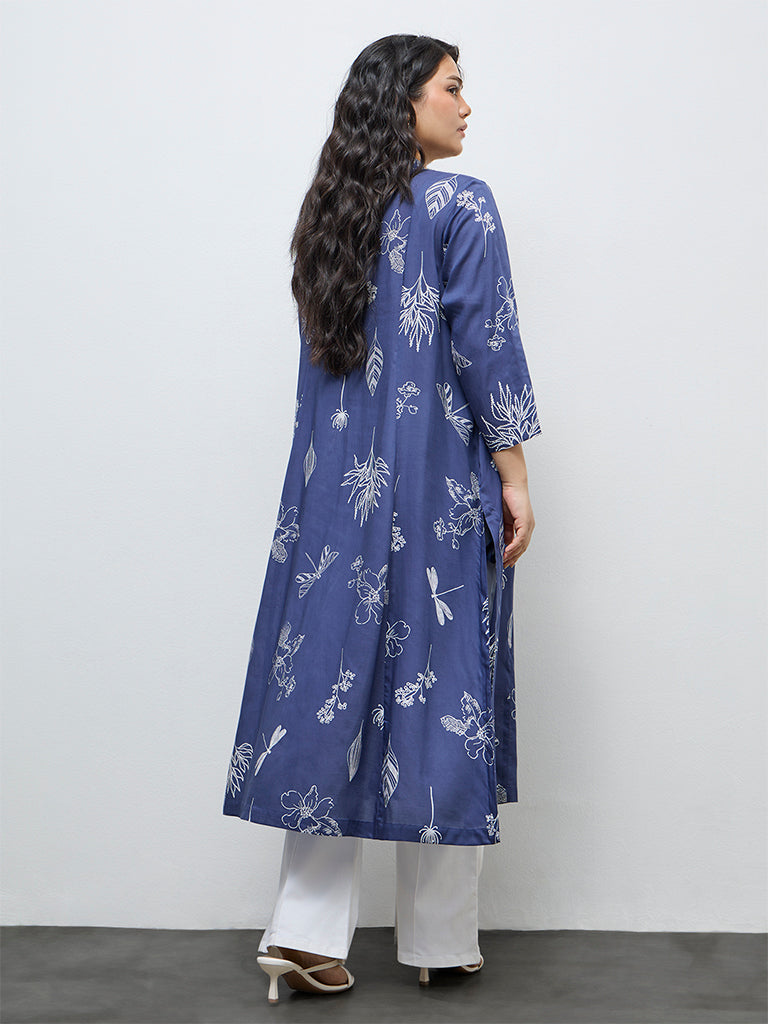 This indigo kurta from Diza features a mix of garden-themed motifs on an A-line silhouette, elevating its ethnic appeal. It is crafted from a soft, premium-blend fabric that delivers a sumptuous feel through the day. A collared and 3/4th sleeves decorated defines the shape, while side pockets add a practical element. A balanced choice for regular ethnic wear with a polished finish.