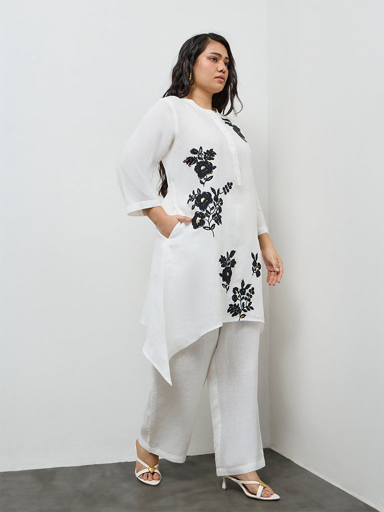 Diza White Floral Embroidered A-Line Linen Kurta