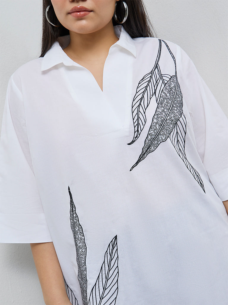 Lighten festive dressing with this white tunic from Diza, adorned with delicate leaf embroidery at the front. Spun from pure cotton, it features a subtle high-low silhouette that adds movement and grace. The V-neck collar and three quarter sleeves lend a flattering, airy feel.