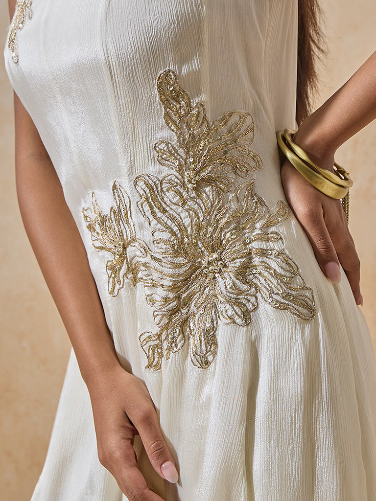 For the woman who prefers her glamour subtle, this white dress is all about timeless allure. Crafted with a round neckline and sleeveless design, it’s detailed with glistening gold embroidery that enhances its fluid structure. The result is a silhouette that’s elegant, effortless, and undeniably graceful.