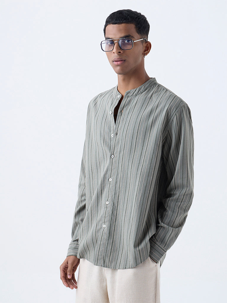 ETA introduces this sage shirt showcasing stripe patterns on a cotton-rich fabric base. Designed in a relaxed-fit silhouette, it features a mandarin collar, a button-up front and full sleeves. A polished essential that brings ease and refinement to dressed-up casual looks.