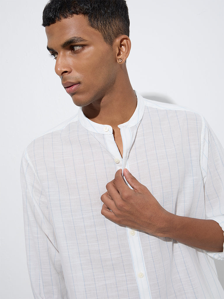Woven from a cotton-rich fabric, this white shirt from ETA showcases timeless stripe patterns across a resort-fit silhouette. Styled with a mandarin collar, a button placket and full sleeves, it’s a stylish staple designed for everyday wear.