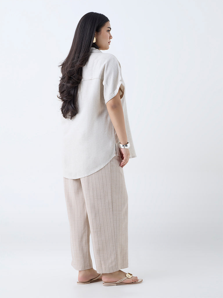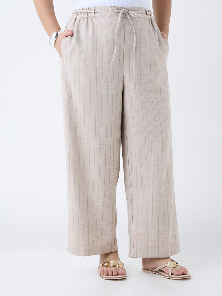 Gia Beige Pinstriped High-Rise Trousers with Belt