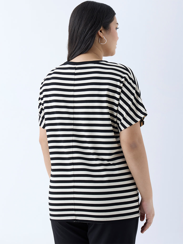 This black tee from Gia is defined with stripe prints that add visual interest to its minimalist design. Milled from an ultra-lightweight fabric, it’s framed with a round neck and relaxed dolman sleeves that enhance its appeal.