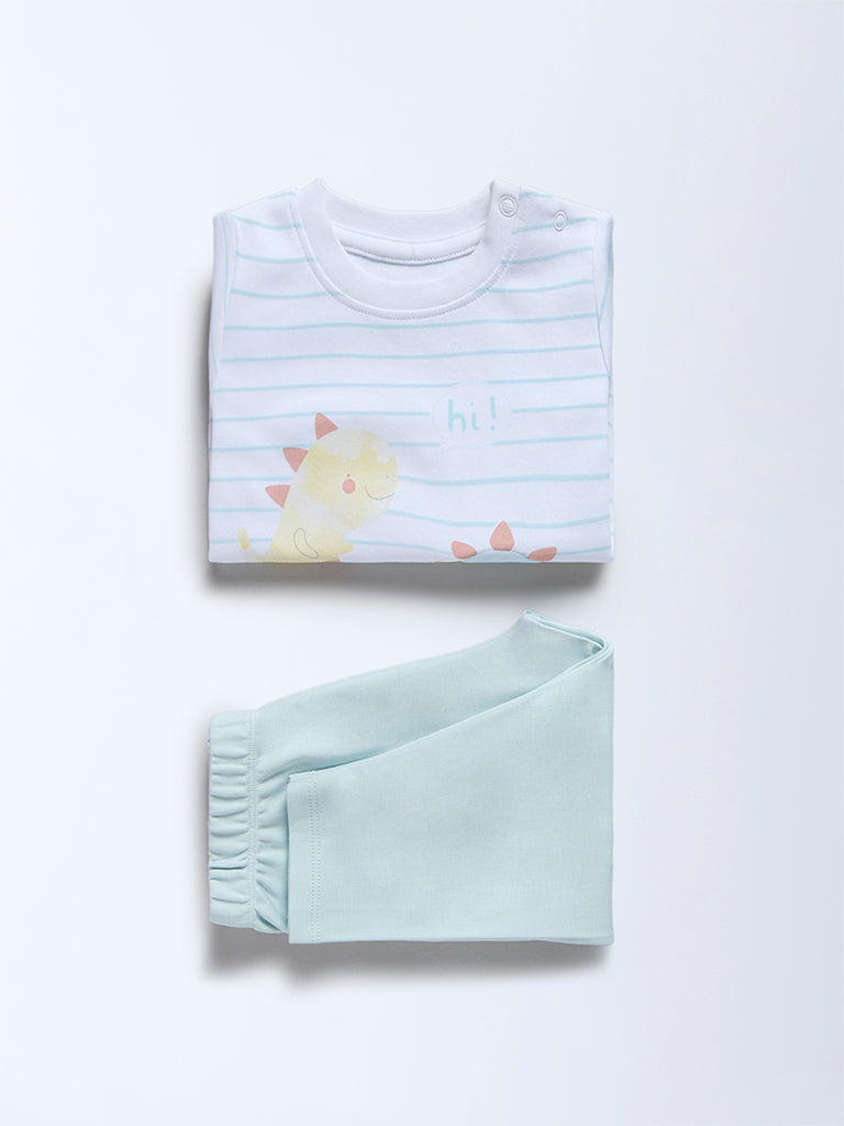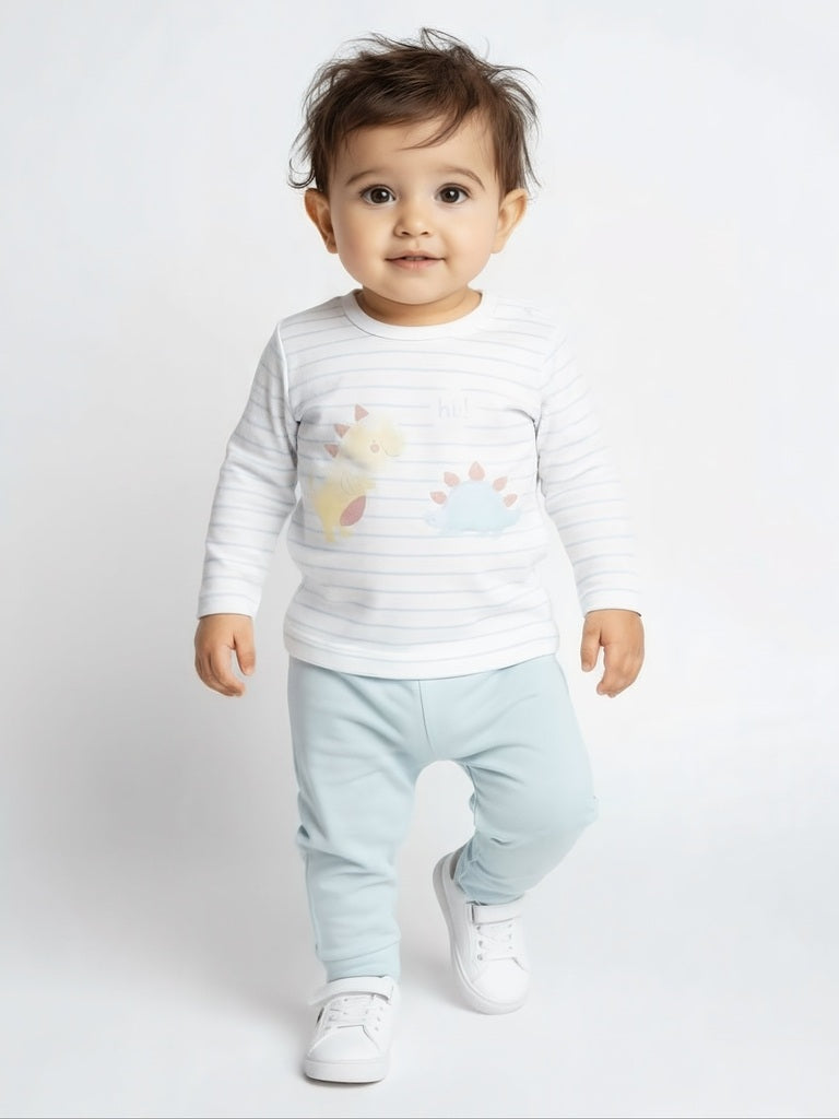 HOP Baby presents a multicolour co-ord set featuring a soft striped t-shirt with adorable dinosaur motifs. Designed with a crew neckline, full sleeves and snap-button shoulders for quick, gentle dressing. Paired with solid mint pants featuring an elasticated waistband for a secure, comfy fit. Crafted from premium pure cotton that keeps your baby warm yet breathable through active play. A snug, easy-moving set ideal for everyday comfort.