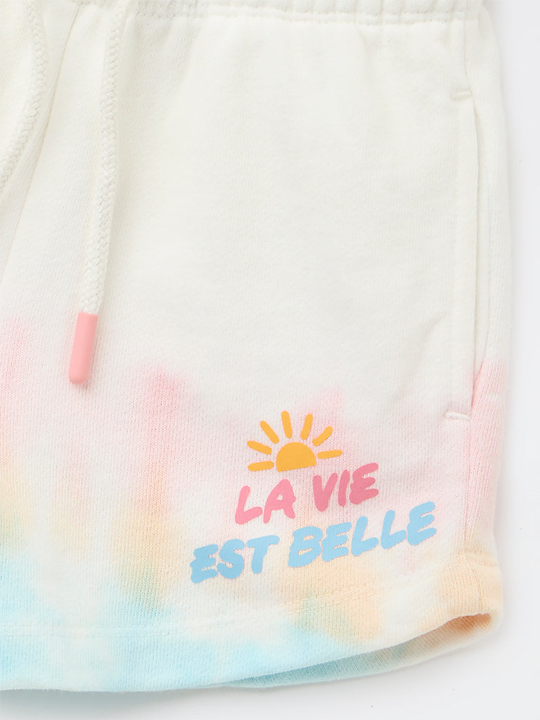 Add a splash of fun to casual days with these off-white shorts from HOP Kids. Styled in a vibrant tie-dye profile with text detailing at the front, they are crafted from a cotton-rich fabric for lasting comfort. The elasticated drawstring waistband ensures a secure fit, while side pockets complete the relaxed design.
